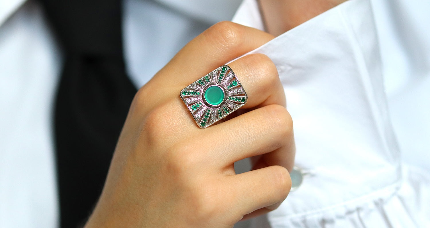 Bague Art Deco Célestine Argent Onyx vert et Onyx noir