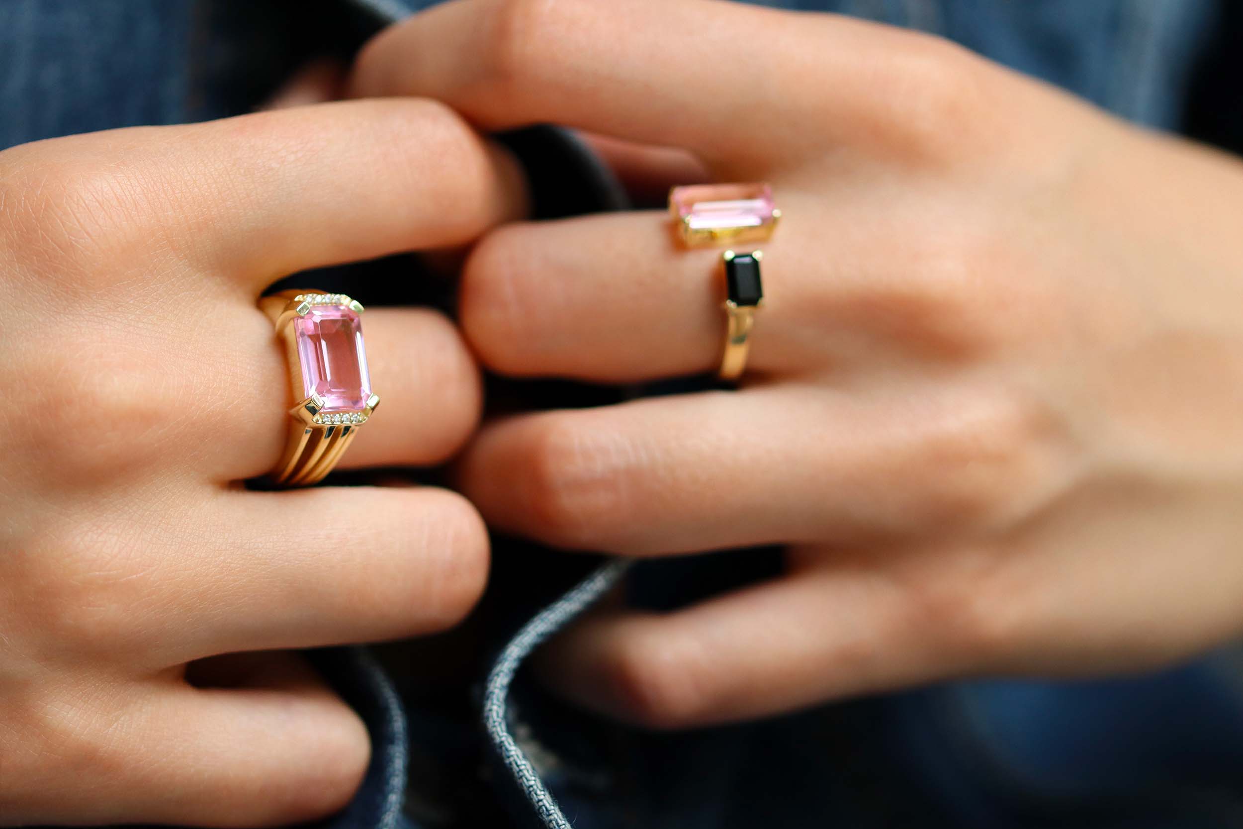 Odette: Bague plaqué or Quartz rose et Onyx noir