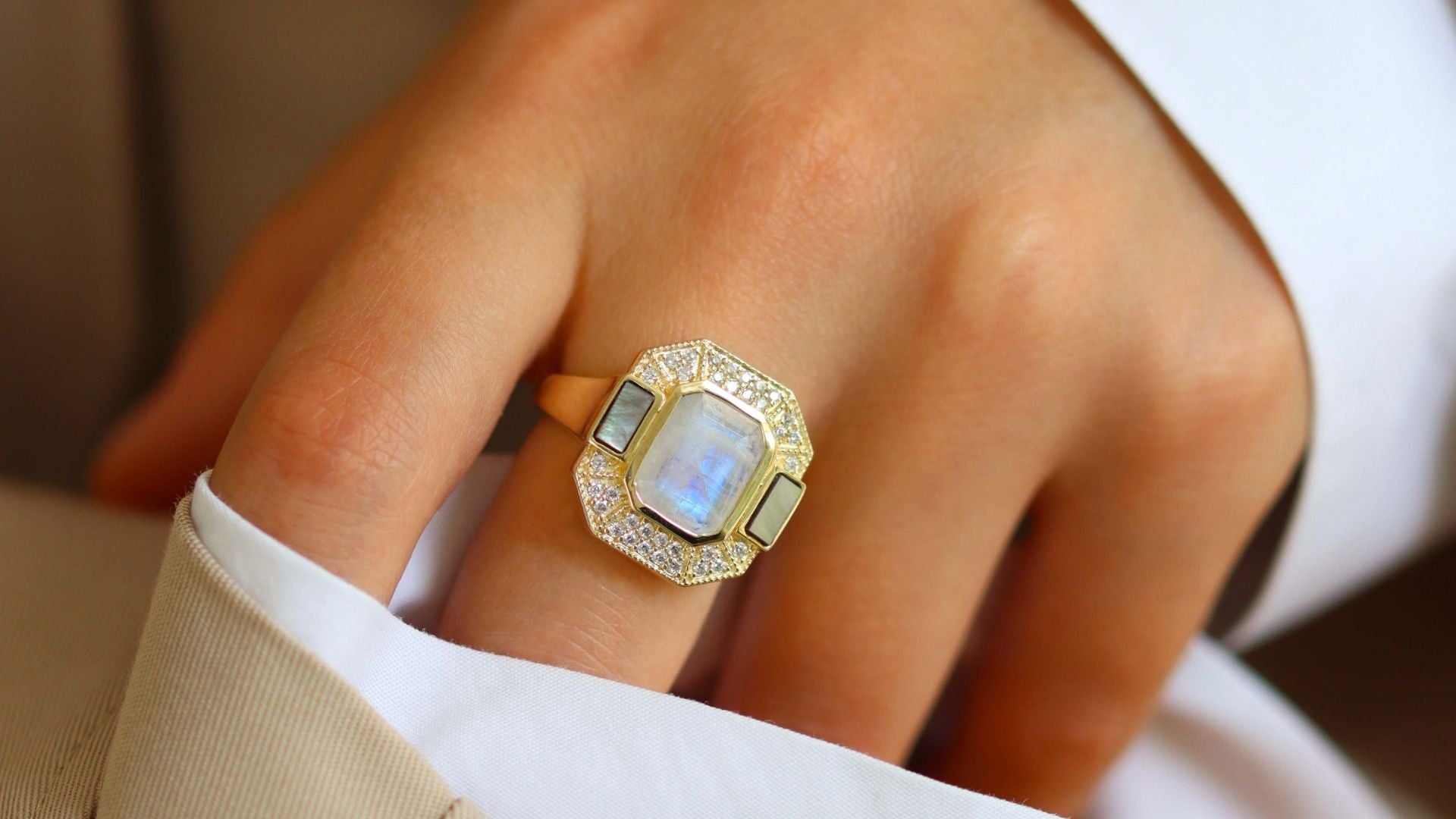 Bague Art Deco Célestine plaqué or Pierre de lune et Nacre grise